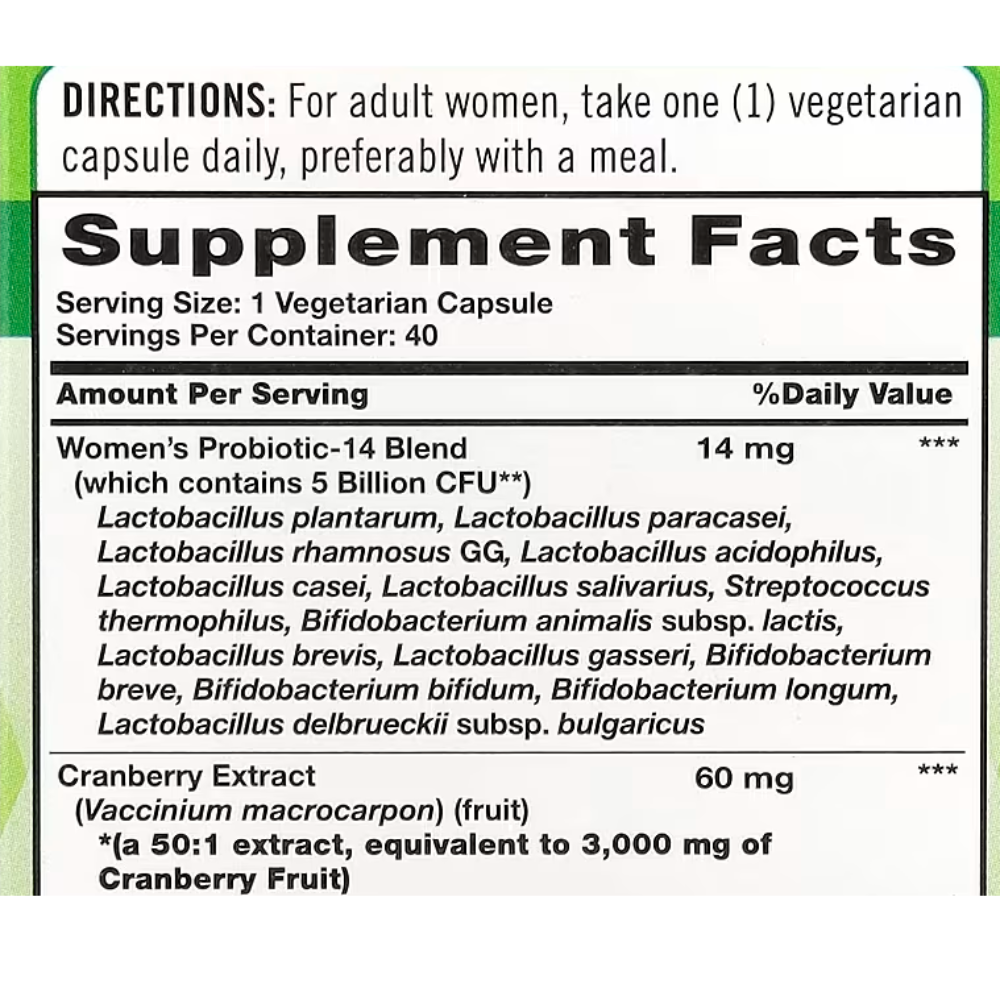 Ofrece 5 mil millones de UFC de 14 cepas probióticas y extracto de arándano rojo (3000 mg equiv.) para promover la salud vaginal, urinaria y digestiva. Ideal para el equilibrio de la flora y defensa inmunológica, se recomienda una cápsula diaria, preferiblemente con comidas, siendo un producto vegetariano y sin gluten.